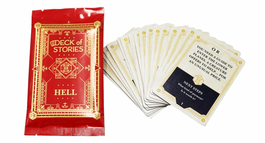 The Hell Booster has 18 infernal-themed story hooks only found in this expansion. This pack is perfect for anyone playing Decent into Avernus or similar adventures. The Hell Booster follows the same ORC storytelling system and fits into the overall Deck of Stories card sets. Torture, suffering, and the afterlife await your adventurers as they explore the Hell Booster. Religious sacrifices and incantations will challenge the morals of even the strongest characters. Every decision has a price when you are trying to survive the torments of hell.