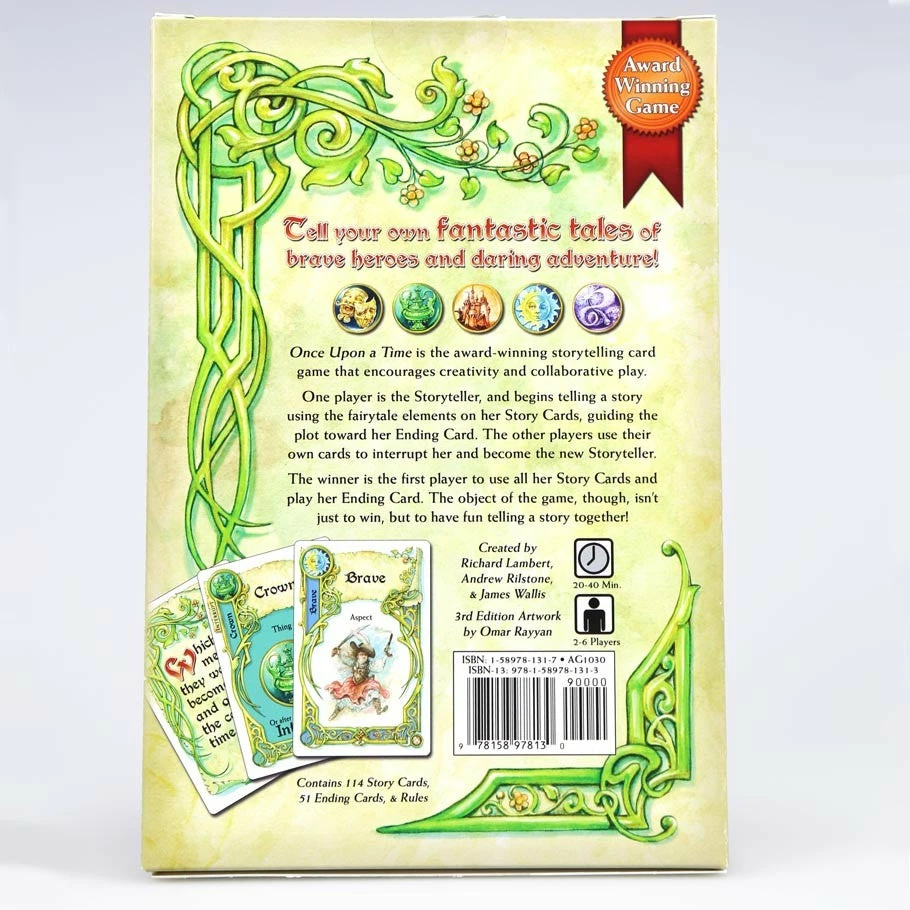 Once Upon a Time is the award-winning storytelling card game that encourages creativity and collaborative play. Once player is the Storyteller, and beings telling a story using the fairy tale elements on her Story cards, guiding the plot toward her Ending Card. The other players use their own cards to interrupt her and become the new Storyteller. The winner is the first player to use all her Story Cards and play her Ending Card. The object of the game, though, is not so much to win as to have fun creating a story together.