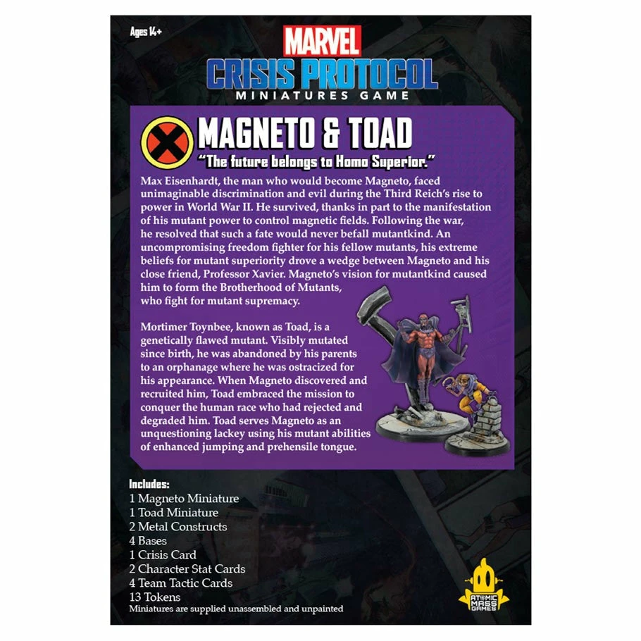 Mortimer Toynbee, known as Toad, is a genetically flawed mutant. Visibly mutated since birth, he was abandoned by his parents to an orphanage where he was ostracized for his appearance. When Magneto discovered and recruited him, Toad embraced the mission to conquer the human race who had rejected and degraded him. Toad serves Magneto as an unquestioning lackey using his mutant abilities of enhanced jumping and prehensile tongue.