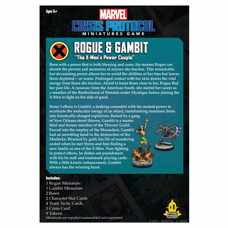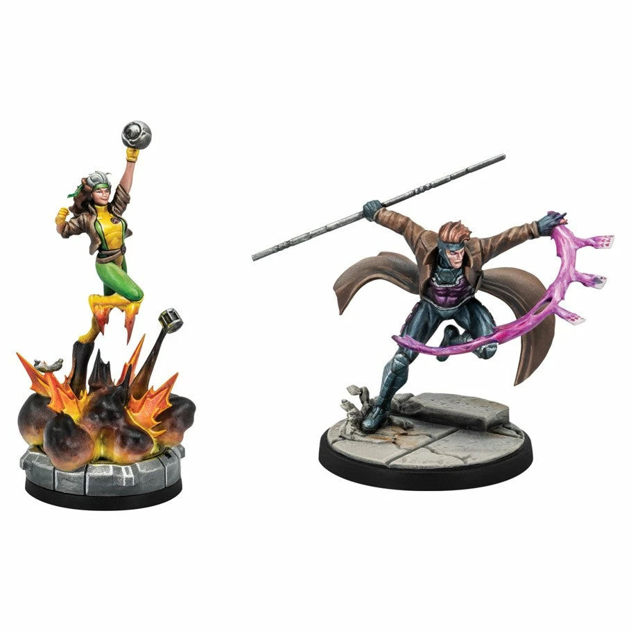 Two iconic characters join the ranks of the X-Men with this character pack for Marvel: Crisis Protocol! Born with a power that is both blessing and curse, the mutant Rogue can absorb the powers and memories of anyone she touches. This remarkable but devastating power allows her to wield the abilities of her foes but leaves them depleted–or worse. Meanwhile, Remy LeBeau is Gambit, a dashing scoundrel with the mutant power to accelerate the molecular energy of an object, transforming mundane items into kinetically-charged explosives. Fighting alongside the X-Men, he dishes out punishment with his bo staff and trademark playing cards.