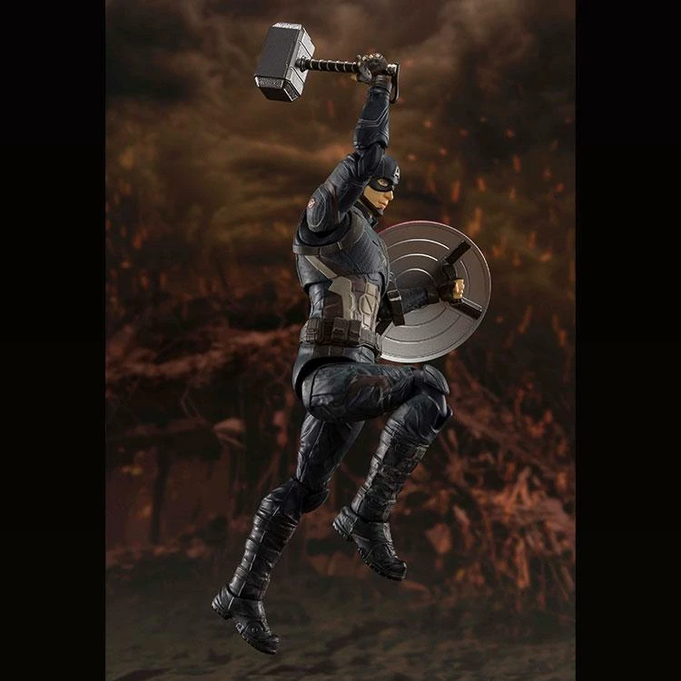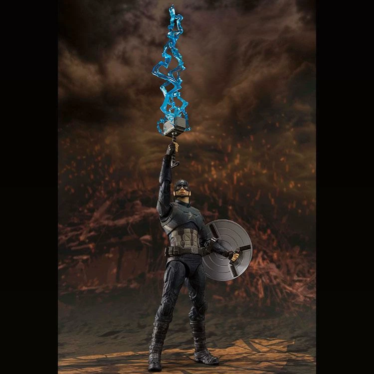 S.H.Figuarts gets even more dramatic! Captain America, as seen in his final form in the epic “Avengers: Endgame,” joins the series! Now you can replicate the film”s thrilling climax in which Cap himself wields Thor”s mighty hammer Mjolnir! The accurately detailed and highly posable figure includes a shield, a shield strap, four optional pairs of hands, two optional heads, a broken shield, Mjolnir, and a Mjolnir effect part.