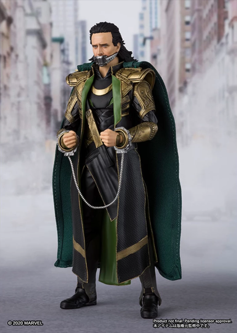 Loki joins S.H.Figuarts in his armored look from “Avengers”! In addition to the handcuffs and mouth restraint that replicate the scene where he was captured, a variety of optional parts are included, such as his staff (extended/stored), the Tesseract, and an optional mischievous smirk face part.