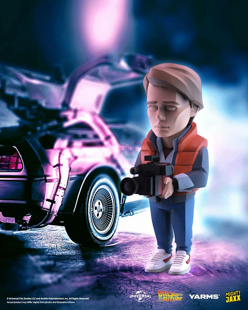 What in the name of Sir Isaac H. Newton is happening here?! We gotta get Back to the Future! Join Doc Brown and Marty McFly as they test out the time-traveling DeLorean for the first time at Twin Pines Mall. Geometric planes and clean contours capture the likeness of both Marty McFly and Doc Brown, with not a tad of unnecessary detail that might break the sleek design. In their hands, they each hold the piece of hardware from the test run of the time-traveling DeLorean – Marty’s camcorder and Doc Brown’s remote. Hijinks await with the Back to the Future x YARMS collectibles, get them today!
