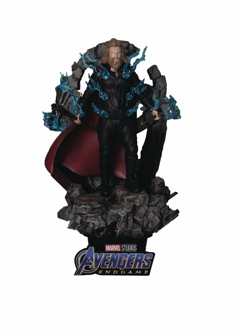 From Beast Kingdom. At the start of Avengers Endgame, a new type of Thor is seen, one a little more laid back and not as dominating as he once was. Unable to get out of his anger of losing the final battle in Infinity War to Thanos, he lets himself go with drinking and video games to while away his time. Yet by the end of the Endgame movie, whilst still a little chubby around the edges, his fighting spirit is back in full force, making the God Of Thunder a force to be reckoned with yet again. The D-Stage-082 sees Thor ready to charge Thanos and his minions with the might of both the Mjolnir hammer and his Stormbreaker axe in both hands. Lightning effects engulf his body as he prepares for the final showdown! Also set against the backdrop of a fallen Avengers logo the stakes had never been this high. The D-Stage Thor is a perfect diorama for fans of the mightiest god to grace our screens!