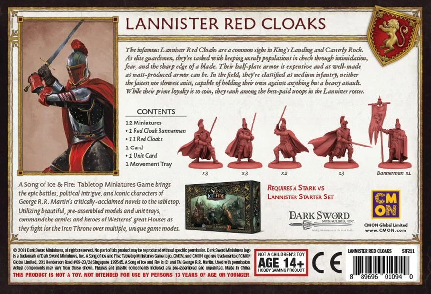 The Red Cloaks unit box for the A Song of Ice and Fire: Tabletop Miniatures Game gives House Lannister players a new medium infantry unit for their force. The Red Cloaks are armored in half-plate, the best that money can buy for mass production. This gives them a modicum of defense, able to turn away blows from all but the strongest enemy soldiers. Being paid well also serves them on the battlefield, as they know they don’t want to lose that next paycheck.