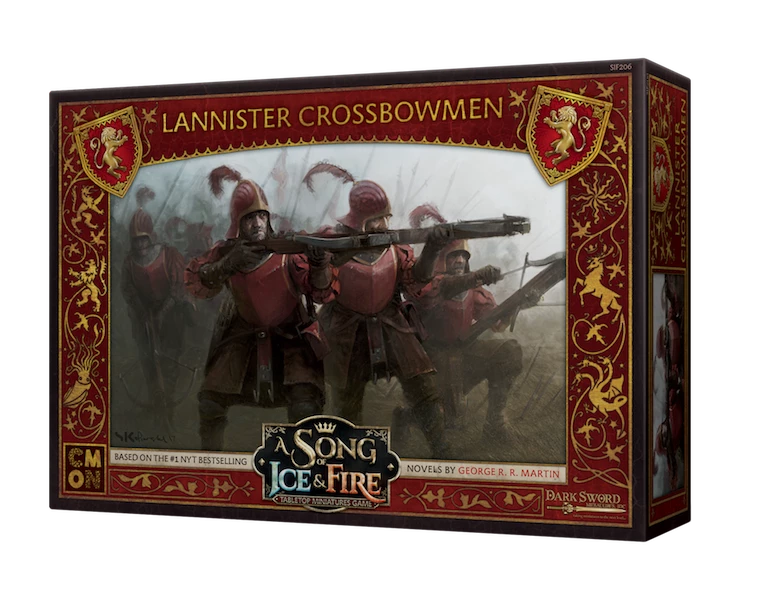 The A Song of Ice and Fire: Tabletop Miniatures Game Lannister Crossbowmen unit box contains 12 miniature figures in four different sculpts, one Unit card, and one Movement Tray. This unit of deadeye soldiers takes advantage of the technology available to a family of means. At close or long range, their bolts can pierce even thick armor. However, a wise Commander will keep them away from melee charges, if possible.
