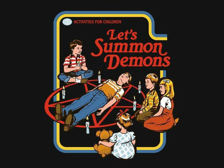 Welcome to Let’s Summon Demons!, the perfect blend of card-based strategy and exciting dice rolling! Based off of one of the most popular pieces in Steven Rhodes’ beloved Sinister 70’s collection, this delightfully dark but tongue-in-cheek “light strategy” game has you assembling a unique team of lovable boys, girls, and animals from “the block”…in order to summon demons!