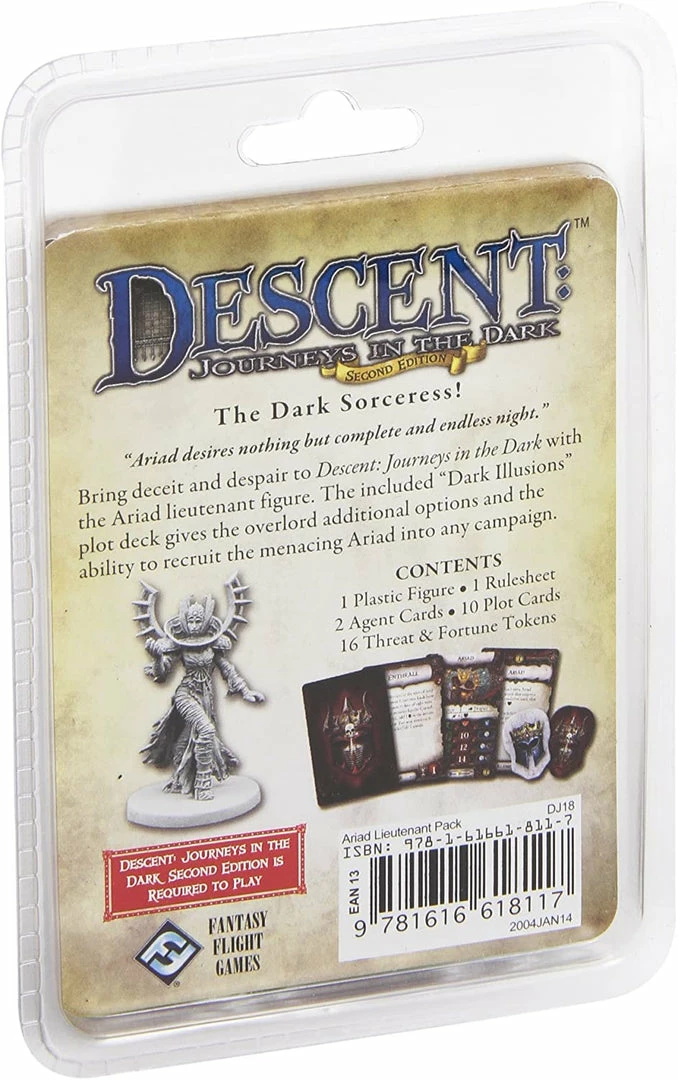 With Lieutenant Packs for Descent: Journeys in the Dark Second Edition, you can replace the game’s lieutenant tokens and bring the overlord’s most powerful agents to life. The Ariad Lieutenant Pack features a detailed plastic figure that places its deadly operative, the deadly illusionist from Labyrinth of Ruin, on equal footing with Terrinoth’s champions. Moreover, it includes a plot deck and rules that allow the overlord to pursue devious new strategies, allowing the sorceress’s deadly phantoms and illusions to challenge Terrinoth’s heroes throughout any campaign!