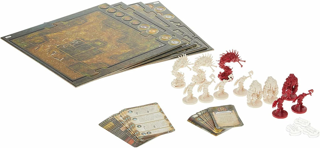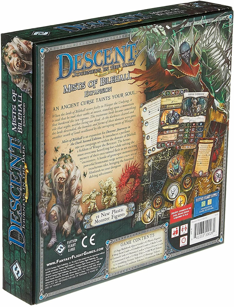 Venture into the Mistlands of Terrinoth in Mists of Bilehall, a new expansion for Descent: Journeys in the Dark! A full, one-act campaign is included in this expansion, chronicling the heroes’ adventures and the dark deeds perpetrated in this misty realm. What’s more, no new heroes or hero classes are included in this Descent expansion: instead, Mists of Bilehall has been configured to enhance the power of the overlord. To that end, your army swells with twelve sculpted plastic figures – six reanimates, three broodwalkers, and three bone horrors. The very ground may give way beneath the heroes with the introduction of old walls and crumbling terrain, while the evil of Bilehall influences the heroes through the introduction of tainted cards. Even the doughtiest heroes will be hard-pressed to survive in this land of mist and half-truths. Enter Waiqar’s domain in Mists of Bilehall!
