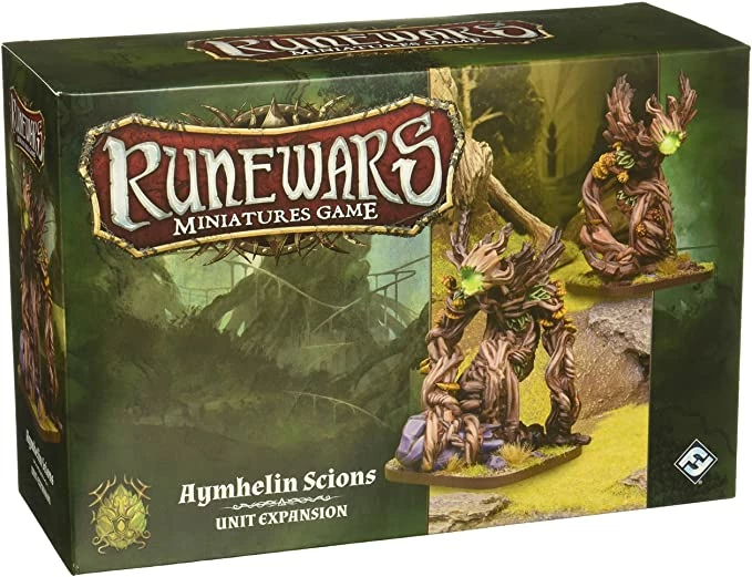 The Aymhelin Scion Unit Expansion for Runewars Miniatures Game includes two Aymhelin Scion Plastic Figures, Two Plastic Siege Movement Trays and eight upgrade cards to enhance your army of Latari Elves!