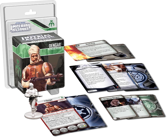 This figure pack offers Dengar’s deadly attacks and cruel tactics to any skirmish strike team. A sculpted plastic figure brings the character to life and replaces the token found in the Return to Hoth expansion. With a new three-card Agenda set, two new skirmish missions, and new Command cards and Deployment cards, the Dengar Villain Pack invites you to hunt down anyone who opposes your laws.