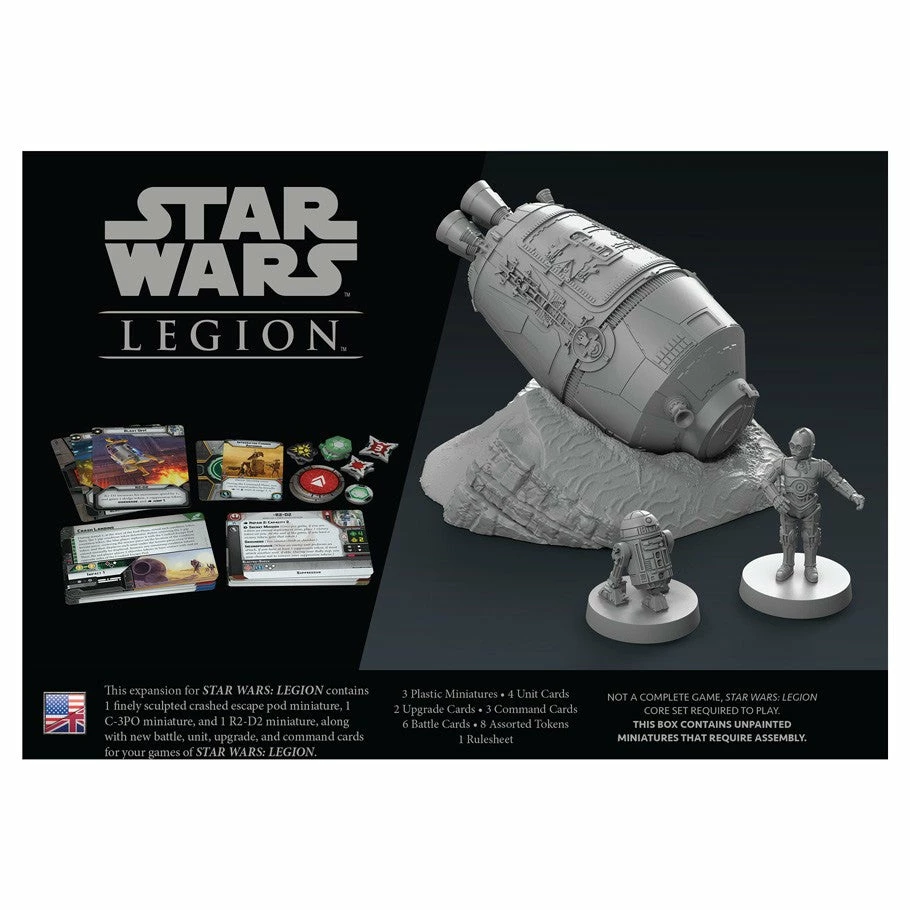 This expansion contains one finely sculpted crashed escape pod miniature, one C-3PO miniature, and one R2-D2 miniature, along with new battle, unit, upgrade, and command cards. The crashed escape pod miniature can be used as a terrain piece to enhance your battlefield or fought over as part of two unique scenarios using the battle cards. Meanwhile, the C-3PO and R2-D2 miniatures can be used as either scenario objectives or fielded as a Rebel Alliance or Galactic Republic unit.
