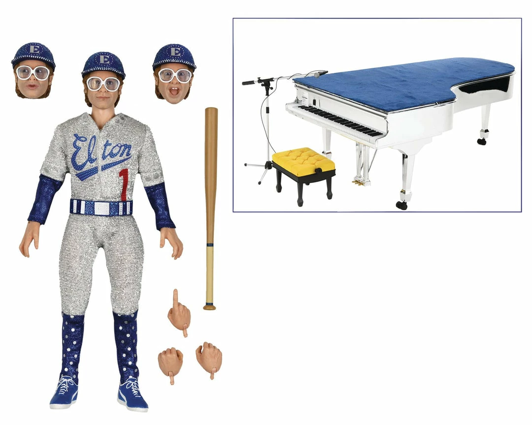 From NECA. In partnership with Elton John, NECA introduces a deluxe tribute to the legend and his profound influence on both music and fashion. The Elton John Live in ’75 action figure stands 8″ tall and sports one of his most famous stage costumes: the glammed-up baseball uniform from his October 1975 concerts at Dodger Stadium in Los Angeles. NECA has gone all out to commemorate that landmark occasion with a scaled piano as it appeared during the show! This deluxe set also includes Elton’s baseball bat, piano bench, microphone stand, interchangeable hands, and three interchangeable heads with different expressions. Window box packaging.
