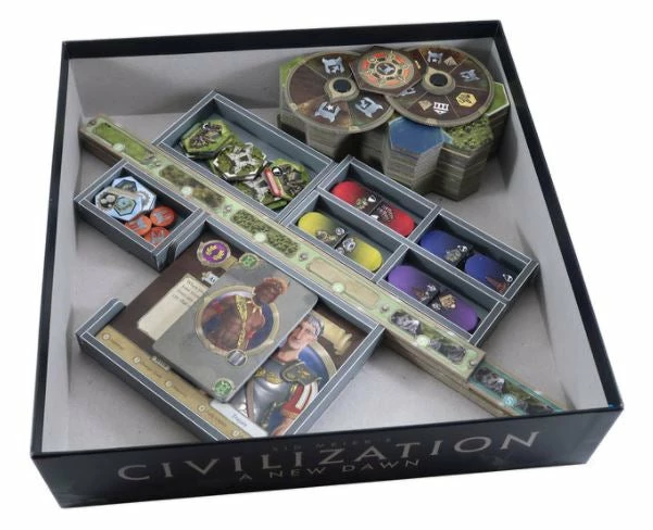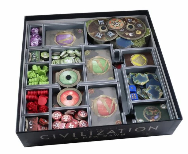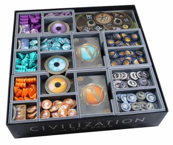 Insert compatible with Civilization: A New Dawn, including the Terra Incognita expansion. The design provides both efficient storage and improved game play. Many of the trays can be utilised during the game, and they greatly aid set-up and clear-away times.