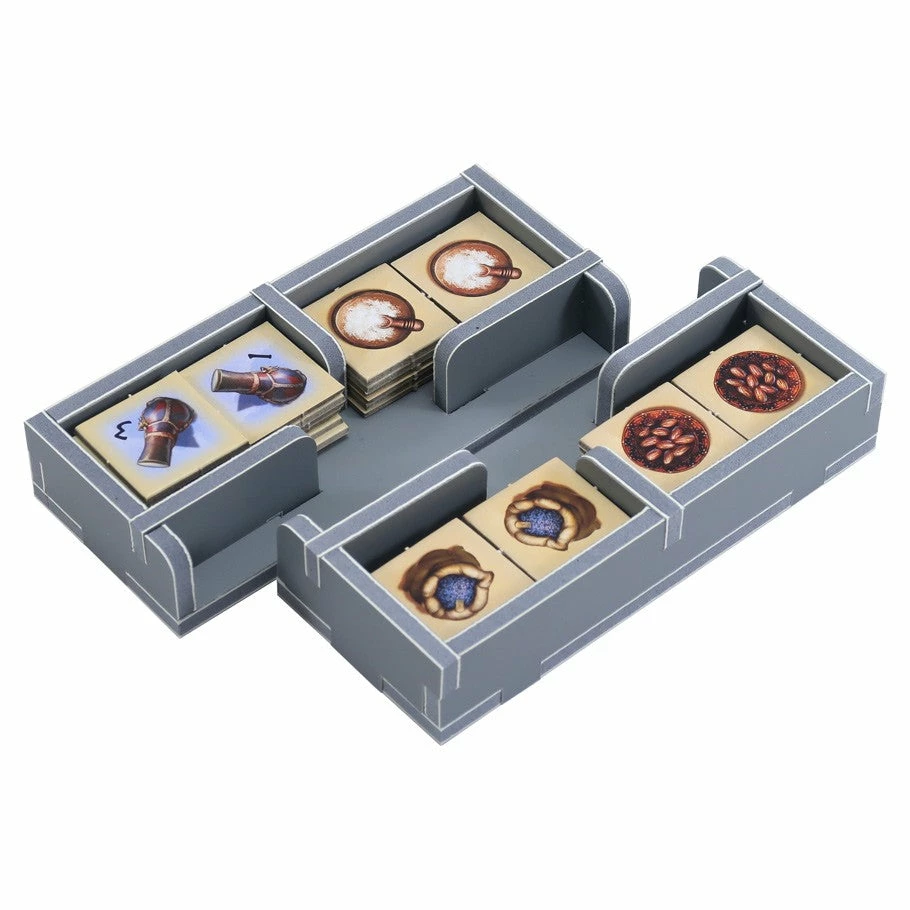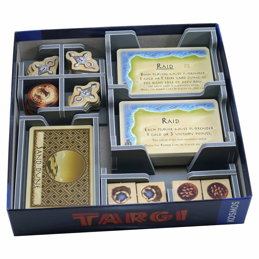Insert compatible with Targi® and Targi: The Expansion®. The design provides both efficient storage and improved game play. The trays can be utilised during the game, and they greatly aid set-up and clear-away times.