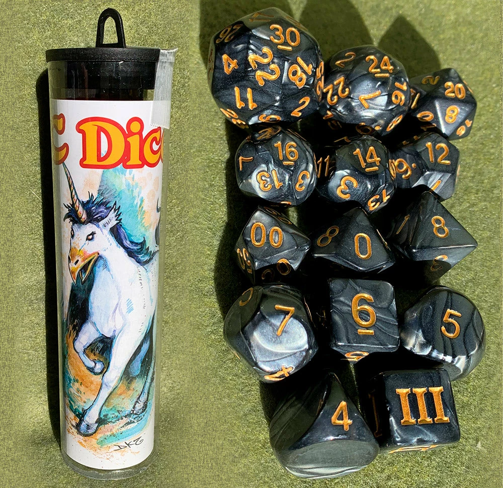 A complete set of 14 dice for DCC RPG, and on the back of the label, description and stats for a new monster! This set contains stats for the Beaked Unicorn, and 14 dice in a marbled black color: D3, D4, D5, D6, D7, D8, D10, D%10, D12, D14, D16, D20, D24 and D30.