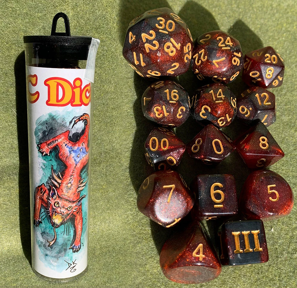 A complete set of 14 dice for DCC RPG, and on the back of the label, description and stats for a new monster! This set contains stats for the Hellcat, and 14 dice in red-black starry sky color: D3, D4, D5, D6, D7, D8, D10, D%10, D12, D14, D16, D20, D24 and D30.