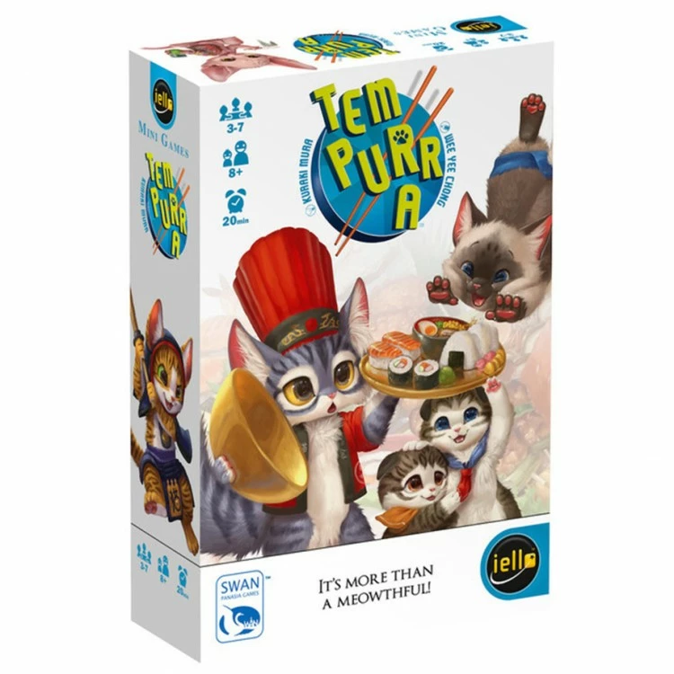 Tem-purr-a is a fun, fast and hilarious game for all ages! Clasic matching card play is combined with push-your luck game mechanics and adorable cat art that makes this a must-have for all cat fans!