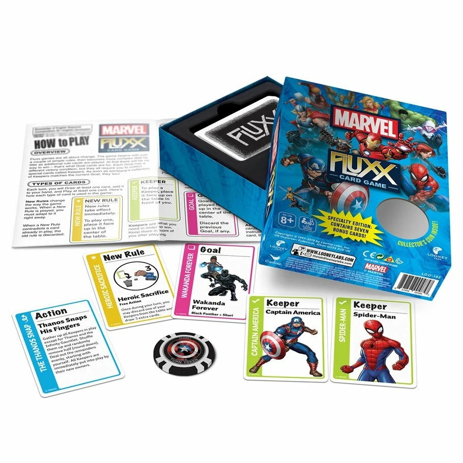 At long last, Fluxx fans can stand up and say “Make Mine Marvel!” Featuring familiar heroes and villains from your favorite Marvel comics, this Fluxx lets you assemble your dream team of Avengers, and much, much more. You might even notice some new super powers for your friendly neighborhood Fluxx! Includes a collectible coin (and 7 bonus cards).