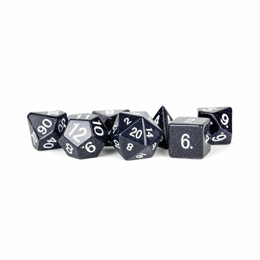 Handcrafted 16mm blue sandstone dice set, comes with 7 dice (d4, d6, d8, d10, d10%, d12, and d20).