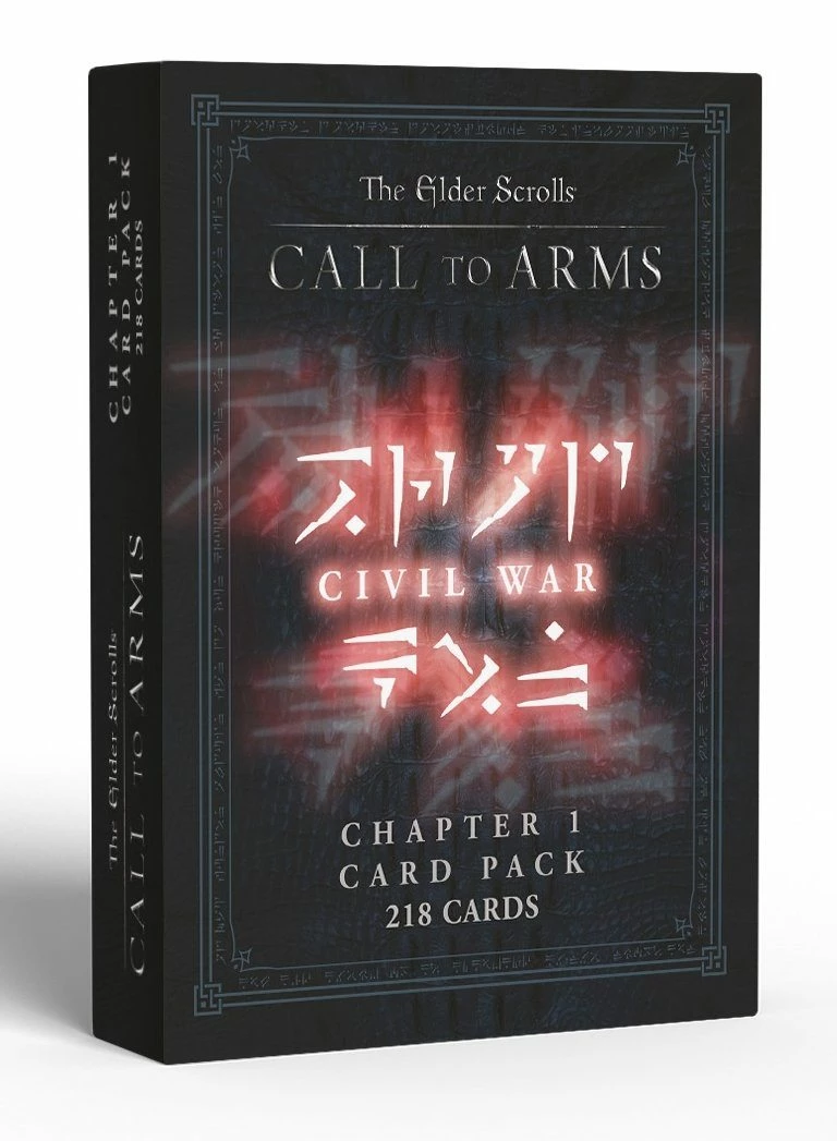 Civil War is the first Chapter Expansion for Elder Scrolls: Call to Arms. It includes cards for Imperial and Stormcloak soldiers, plus additional adventurers and Adversaries such as Draugr and Skeletons. Additional Battle Mode and Delve Quests, Traps and Events expand the narrative adventure game. Equip your heroes with new weapons, spells, armor and enchantments to overcome the dangers of Skyrim. This card pack contains 218 cards containing new heroes, followers, adversaries, upgrades, quests, traps, events and more to allow players to use the new models in Chapter 1 and customize their Elder Scrolls: A Call to Arms miniatures.