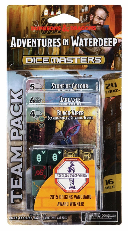 The Dungeons & Dragons Dice Masters: Adventures in Waterdeep Team Pack features the most beloved characters of Waterdeep, including Brawlwin Chainminer, the Black Viper, Jarlaxle, Durnan, and several characters making their very first appearance in Dice Masters! A Team Pack can be paired with any Campaign Box or Starter Set to give a player everything they need to build a highly focused team for thematic play! With 24 cards and 16 dice, this release is perfect when youre trying to enjoy everything Waterdeep has to offer!