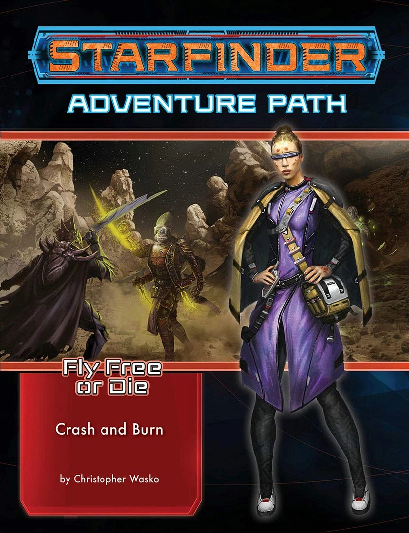 “Crash and Burn” is a Starfinder adventure for four 9th-level characters. This adventure continues the Fly Free or Die Adventure Path, a six-part monthly campaign in which players take on the role of a merchant crew with an experimental starship, trying to get rich, escape interplanetary assassins, and outwit their rivals. This volume also includes a series of “Side Jobs”—short mini-adventures the GM can insert into the campaign at any time—as well as a collection of new and dangerous aliens and details on the corporations that dominate the galaxy.