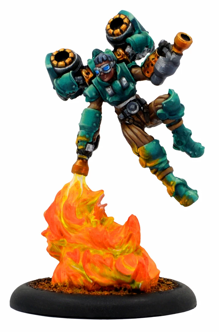 Aline Bennet was once a star ace among Rocketman Corps, as well as a warcaster in training among the Crucible Guard. When the apocalypse came, most of Bennets Corps unfortunately perished. Instead of drowning in sorrow, however, Bennet buried her comrades and used their scavenged gear to build herself a new suit of armor, a suit that combined her skills as a warcaster with that of a high flying rocketman.Despite her tragedy, Aline is cheerful, altruistic, and dedicated to making the wastes a safer place. She patrols the ruined Iron Kingdoms in search of evildoers, whom she happily eradicates with her paired flamethrowers. After scouring a region of evil, Aline will land briefly to deliver a wink, a smile, and a thumbs-up before blasting off again.