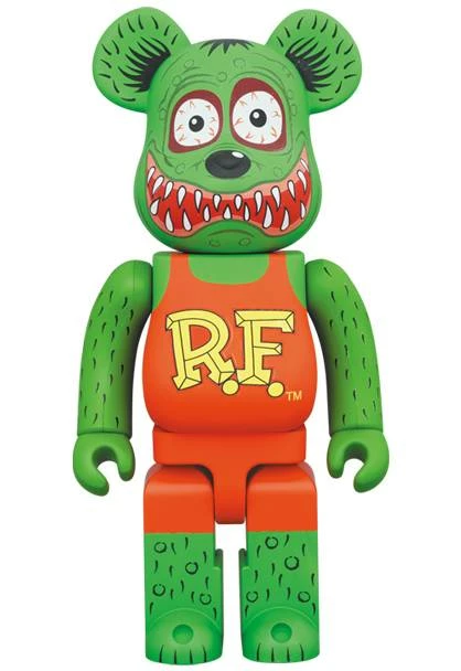 From Medicom Toy. the Be@rbrick collection from Medicom is growing with this BE@rbrick inspired by Rat Fink created by artist Ed “Big Daddy” Roth! Available in a 2-pack of 100% (2 3/4″ tall) and 400% scale (11″ tall) or a 1000% version that stands about 28″ tall.