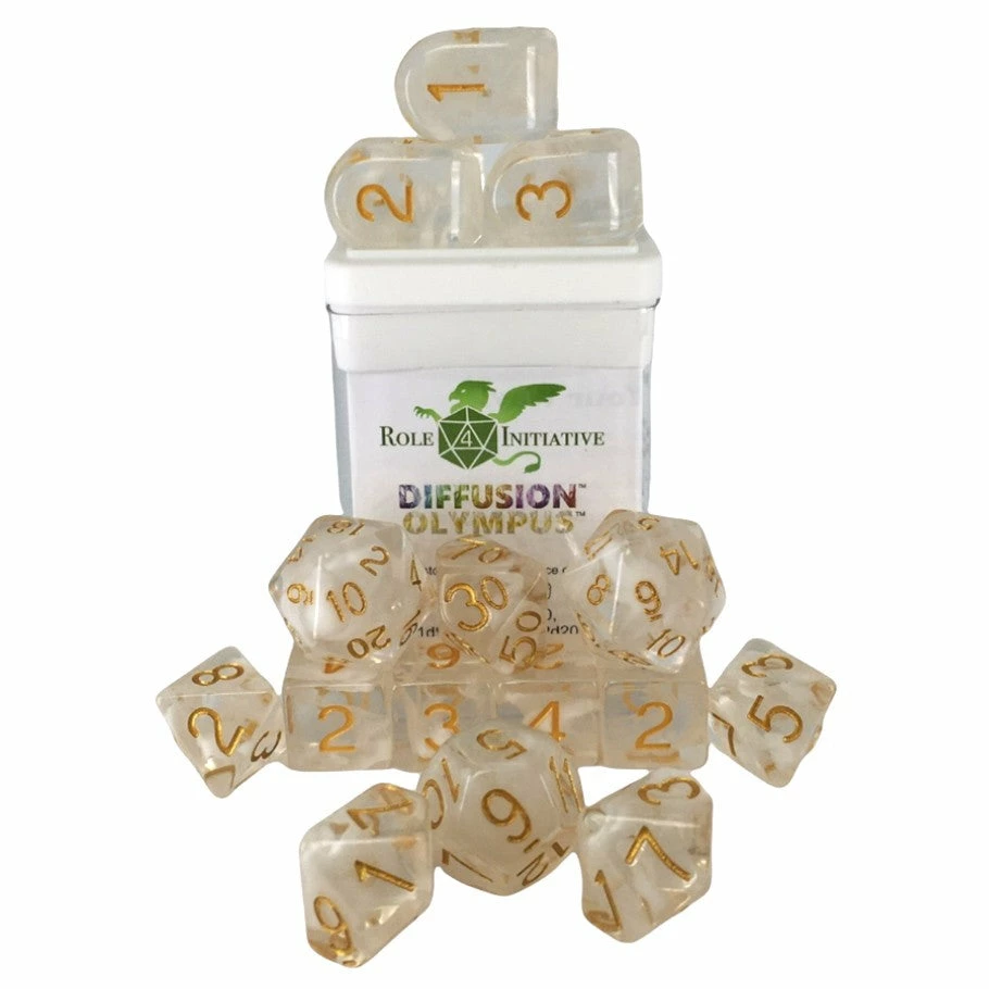 A 15-set of large high-visibility polyhedral diffusion dice. Each set of R4I dice averages about 25% larger in size than traditional dice for higher visibility and better rollability!