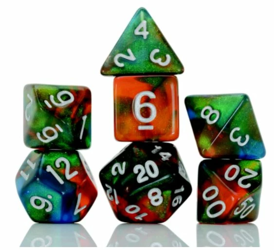 Add some summer flair to your role playing games with this set of orange, blue, and green dice with a slight sparkle.