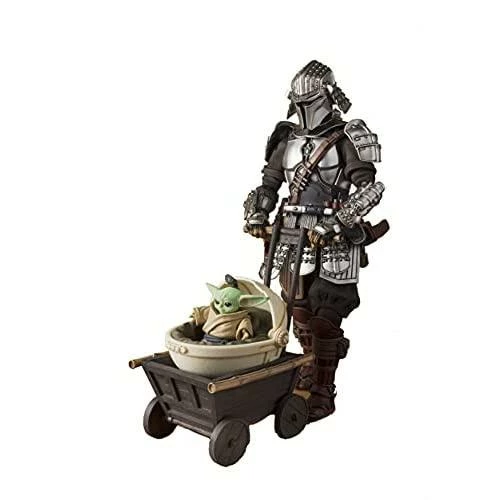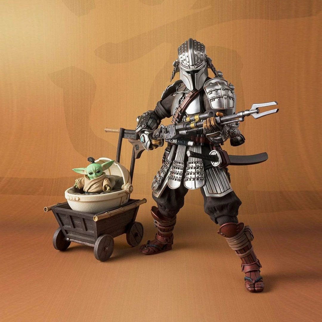 Included with this figure is an in-scale figure of Grogu who can be seated in a pram inspired by wooden pushcarts from the Samurai era of Japanese history. The Mandalorian rifle and blaster are included as is his jetpack that he received at the end of the first season of the show.