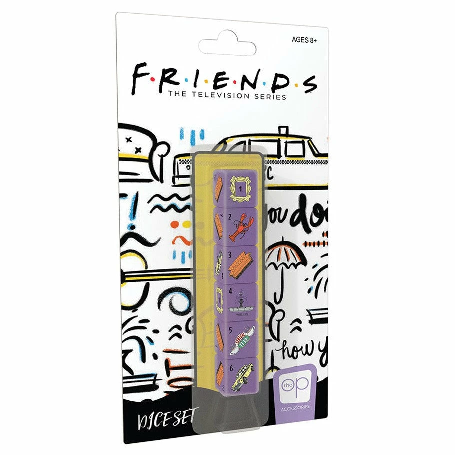 Take some mementos of friendship to your next game night with this Apartment 20-approved set of dice! This 6-sided dice set features illustrations of your favorite 90s comedy series’ props, including the peephole picture frame, life mate lobster, orange couch, fountain, Central Perk sign, and Phoebe’s taxi.