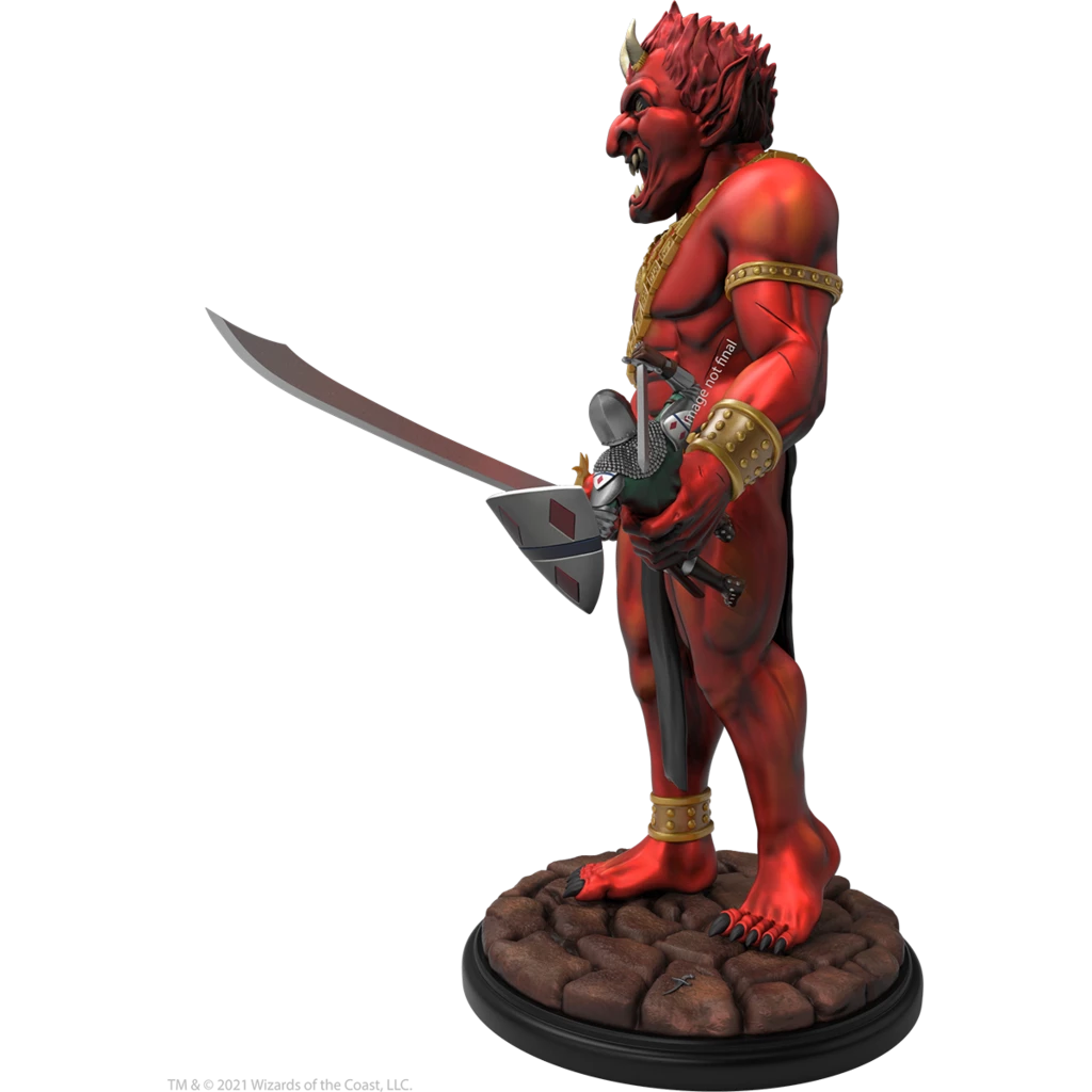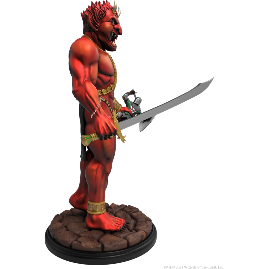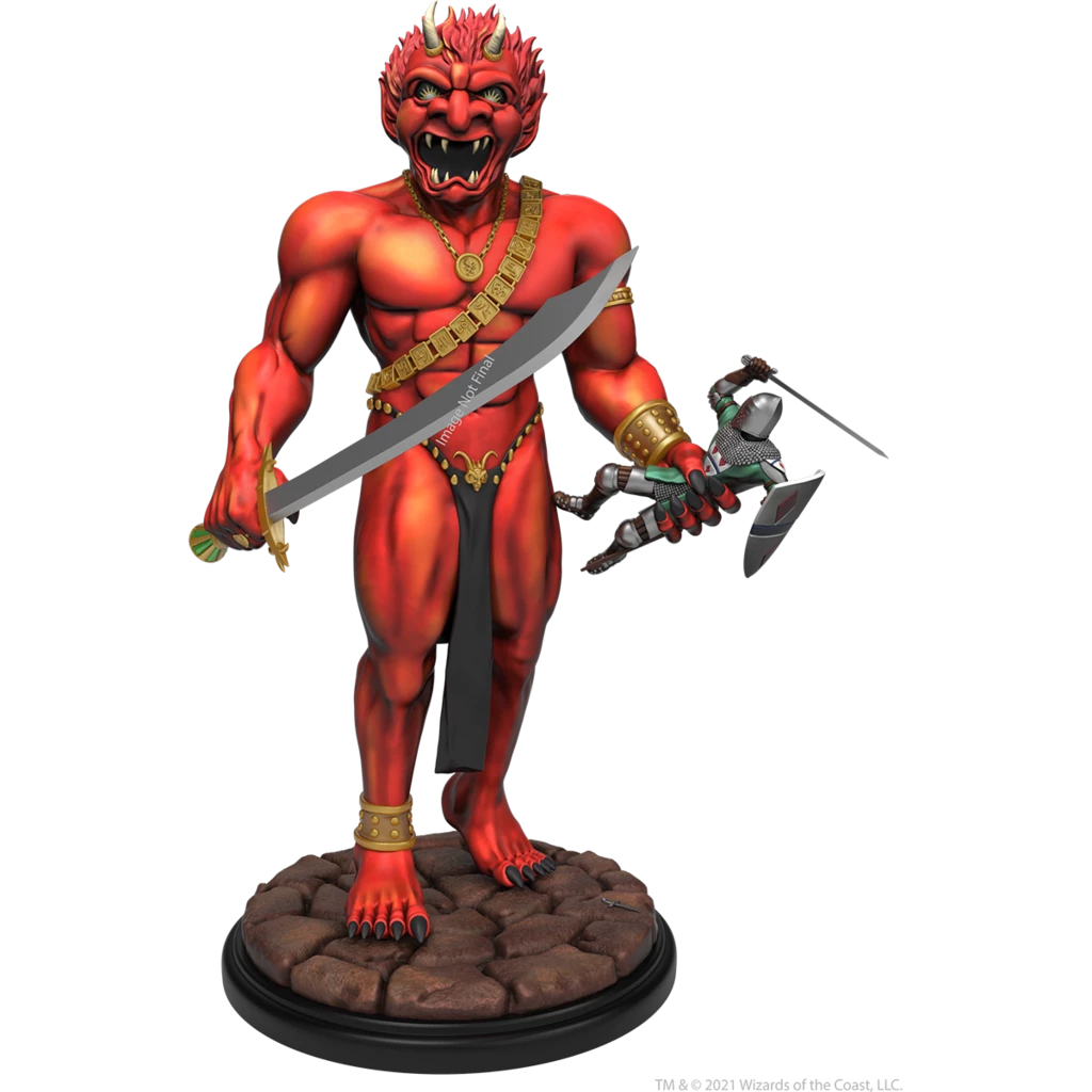 12″ resin statue faithfully recreates the Efreeti featured on the cover of the 1st Edition Dungeon Master’s Guide, but advances the scene to place the sword-wielding knight in the Efreeti’s clutches.